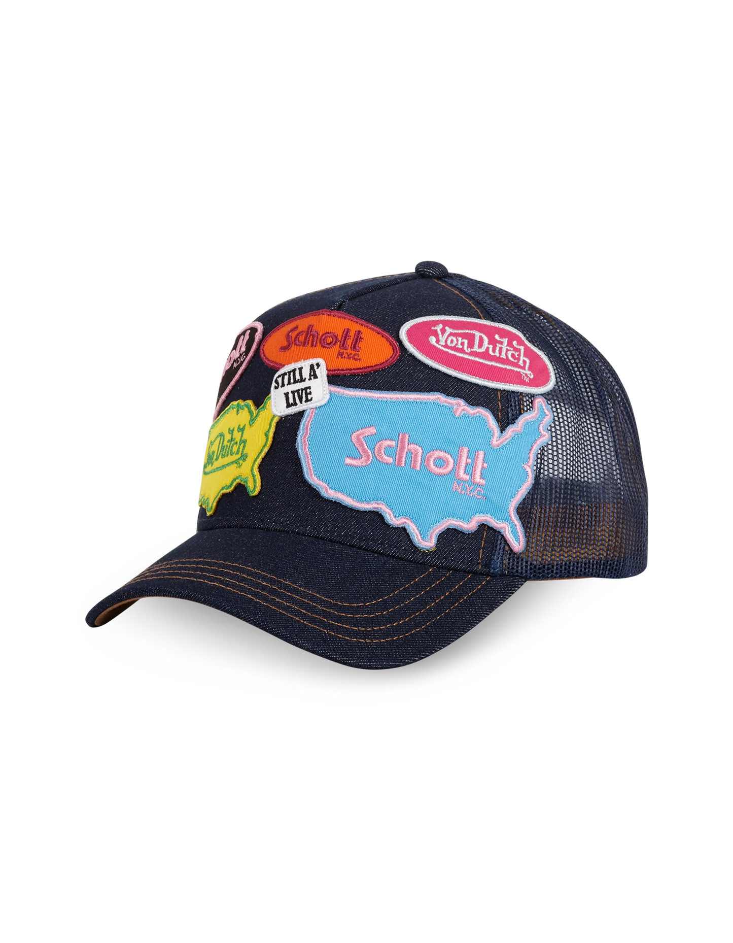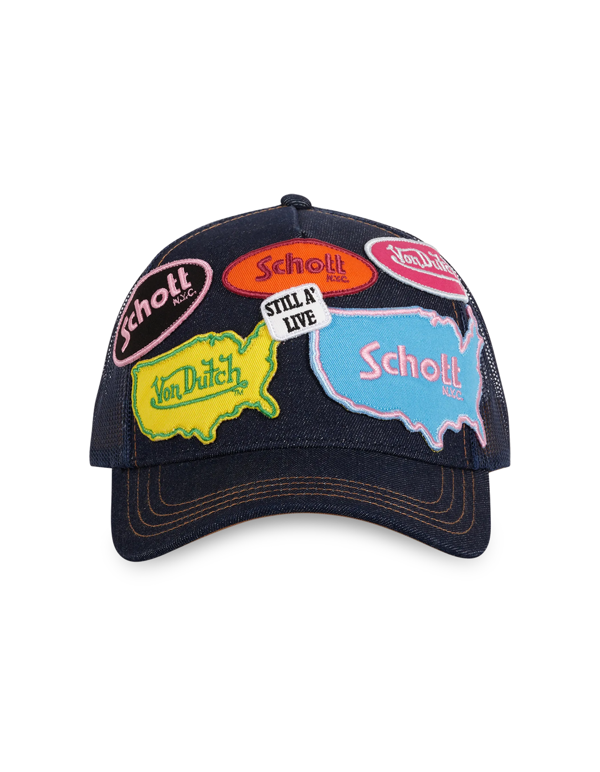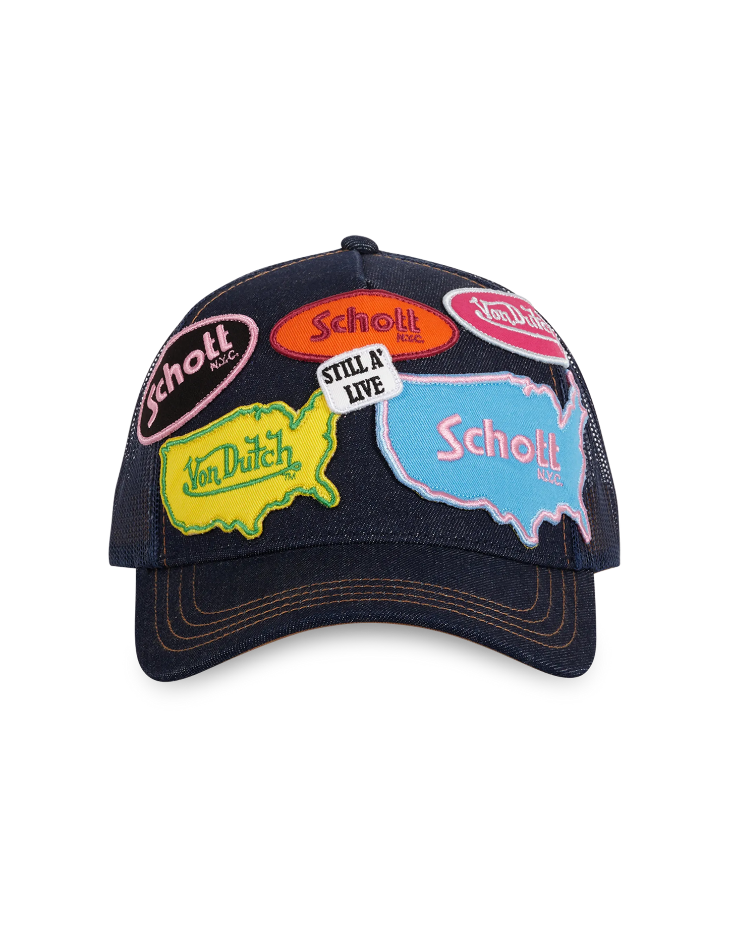 Trucker cap from the collaboration between Schott NYC® and Von Dutch, in denim with patches.