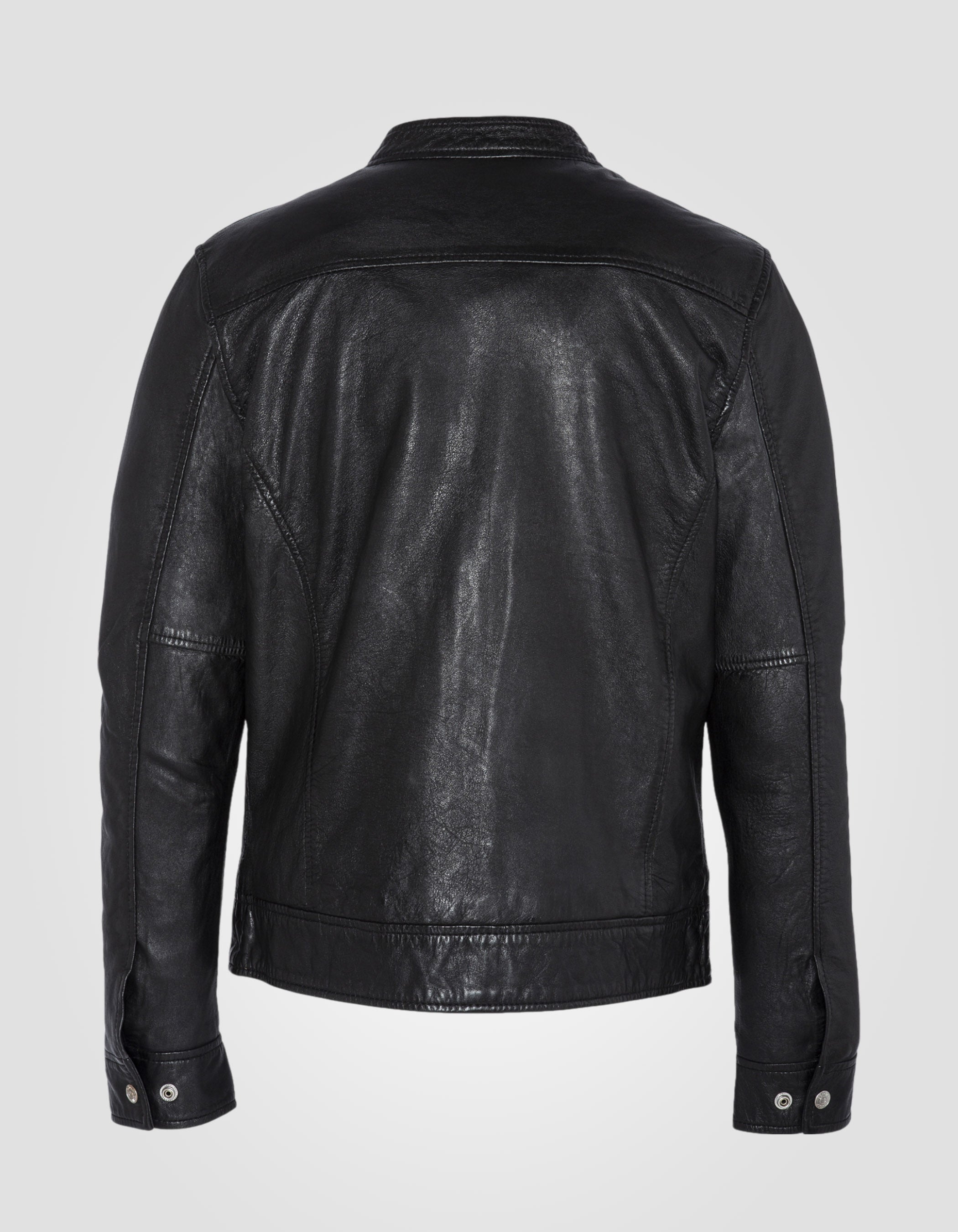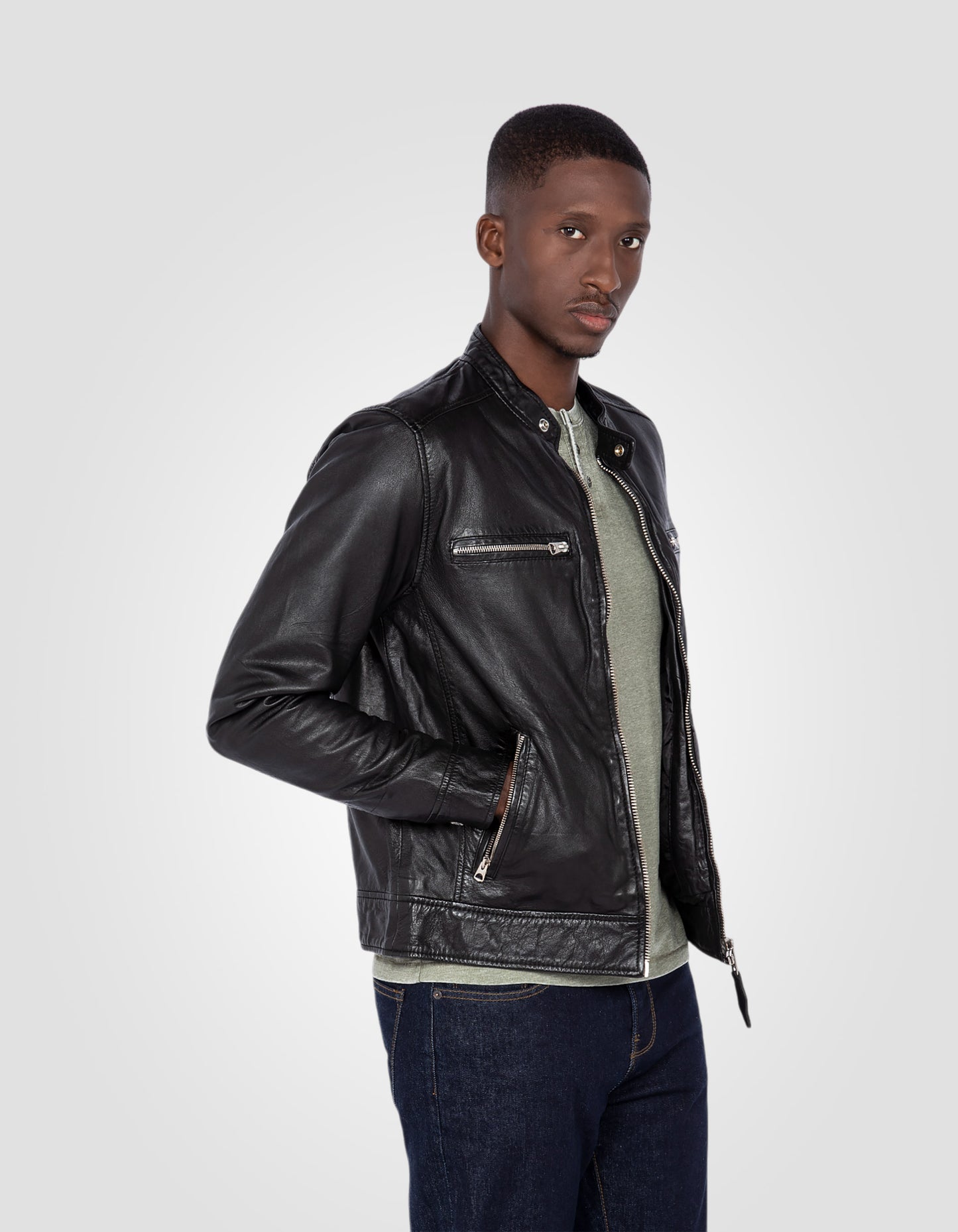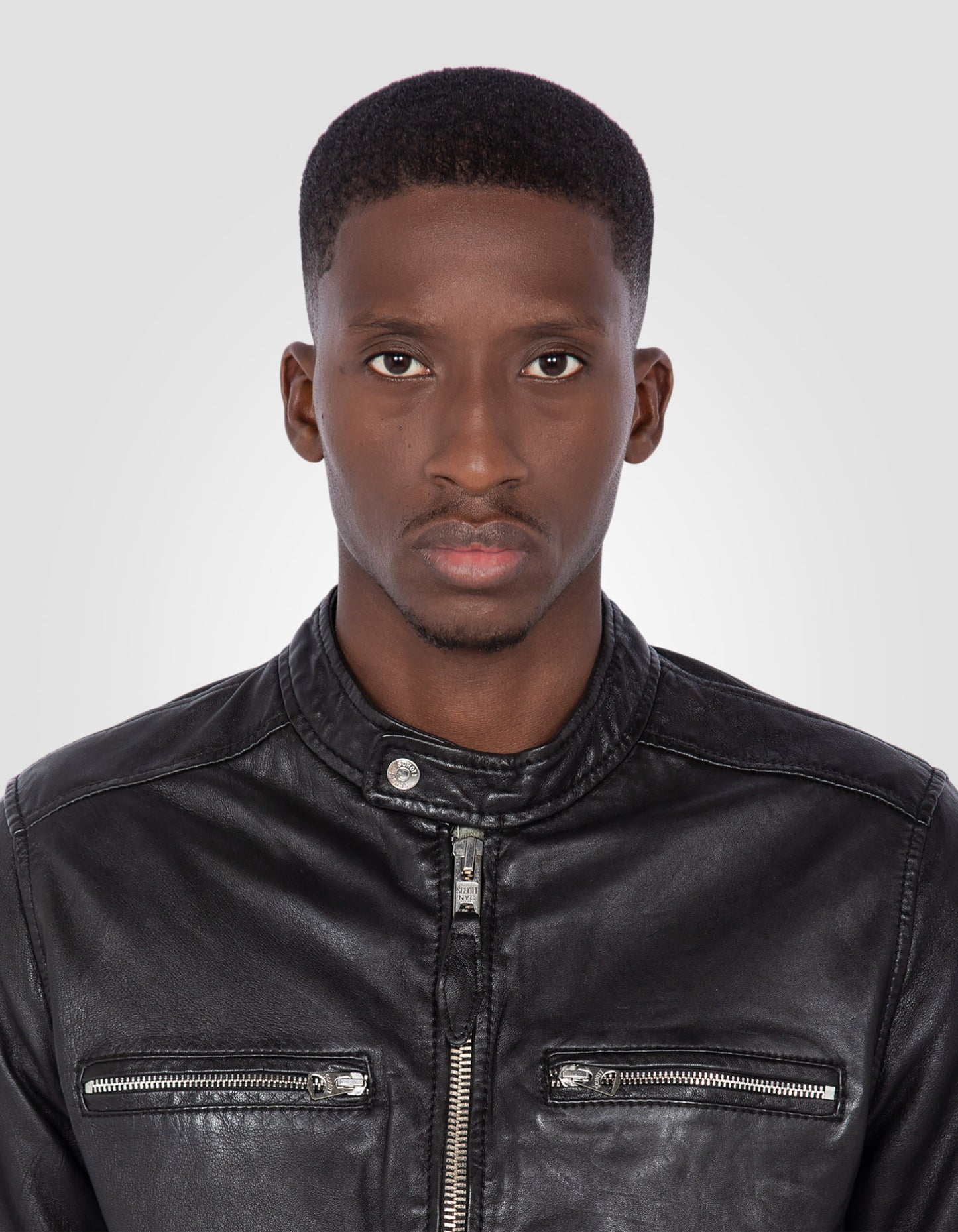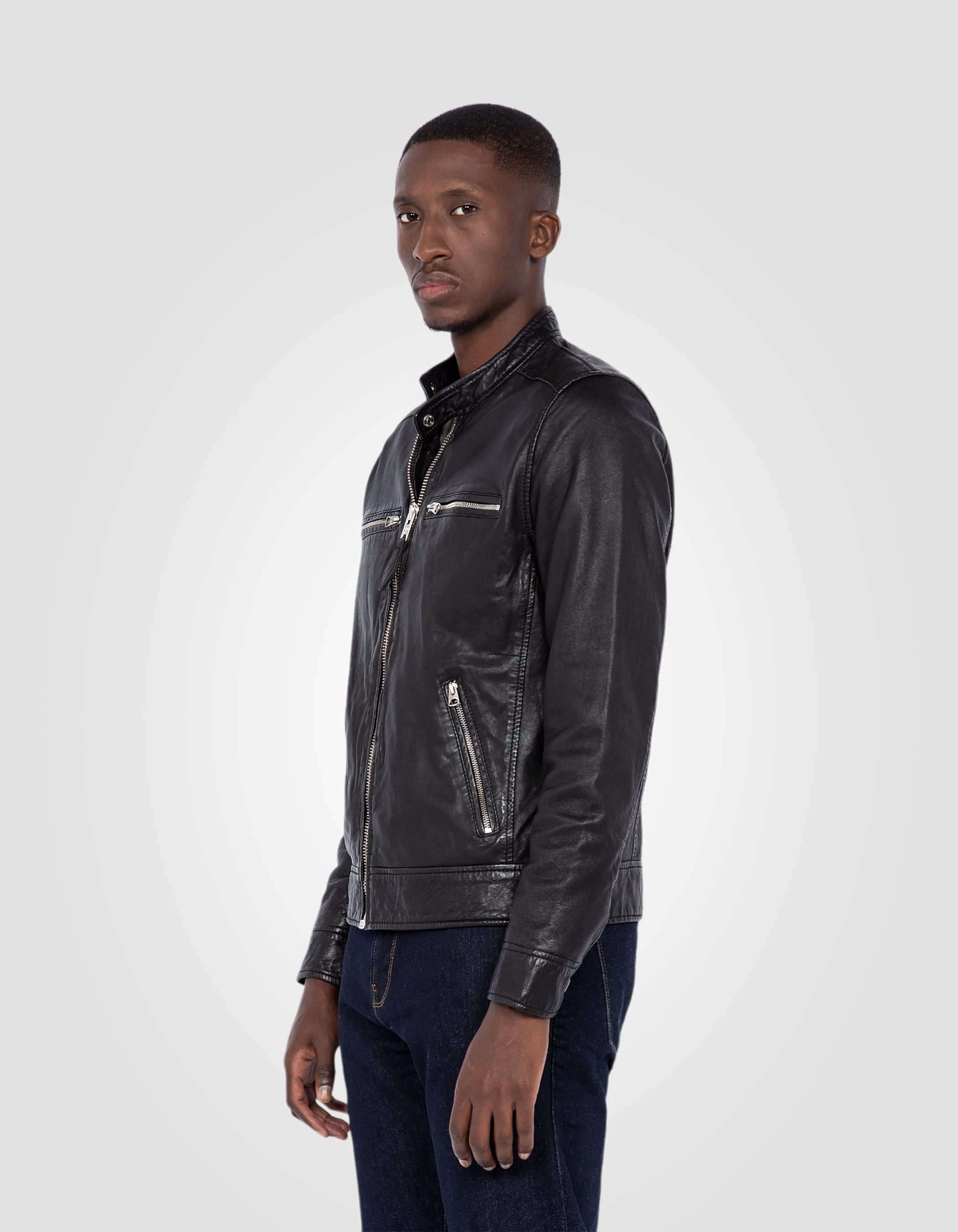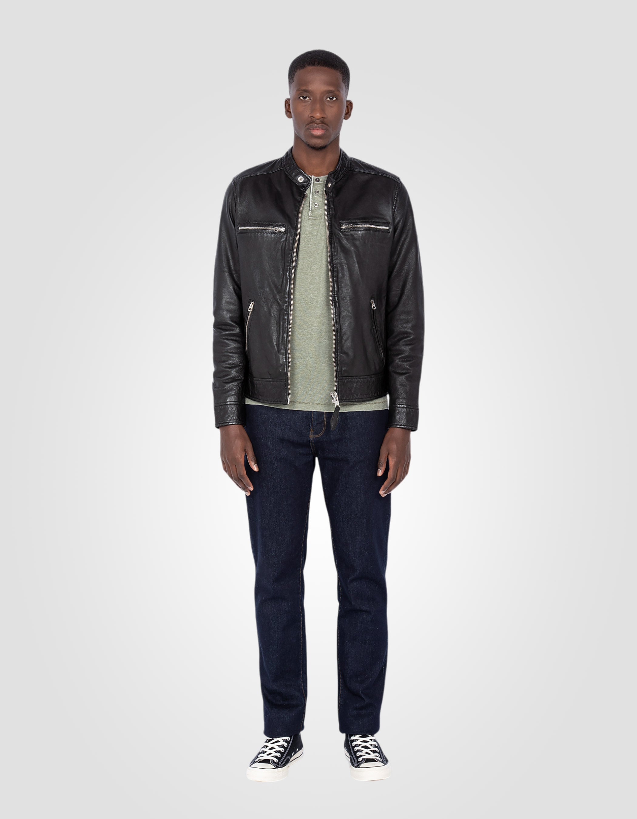 This biker jacket is made of supple leather treated with vegetal tanning. It follows the codes of classical biker jackets.