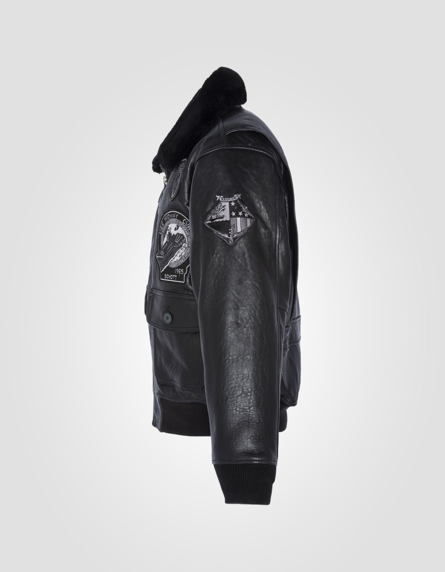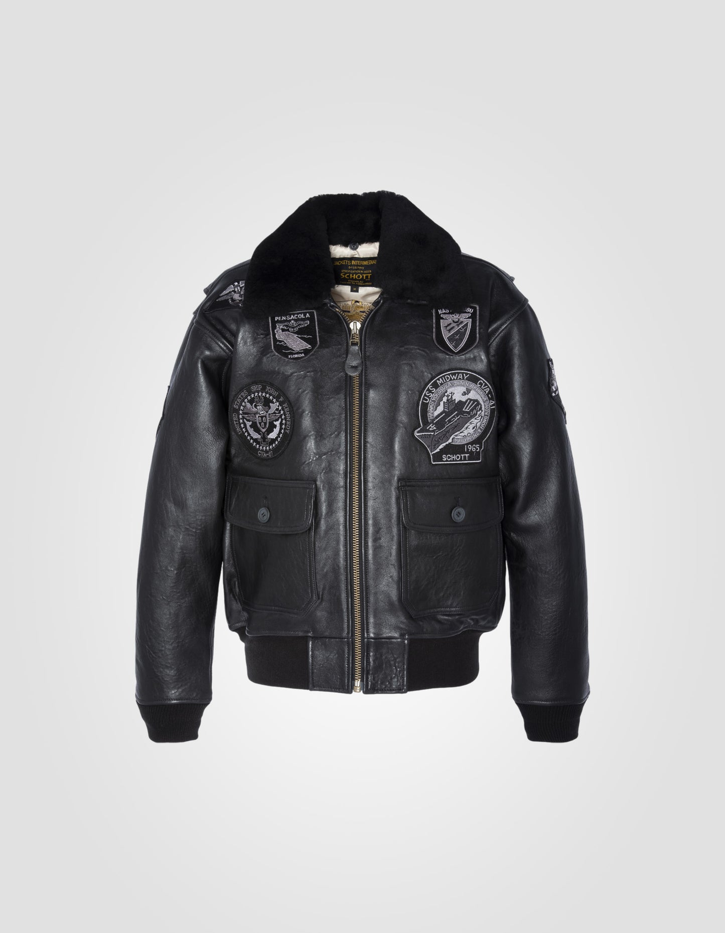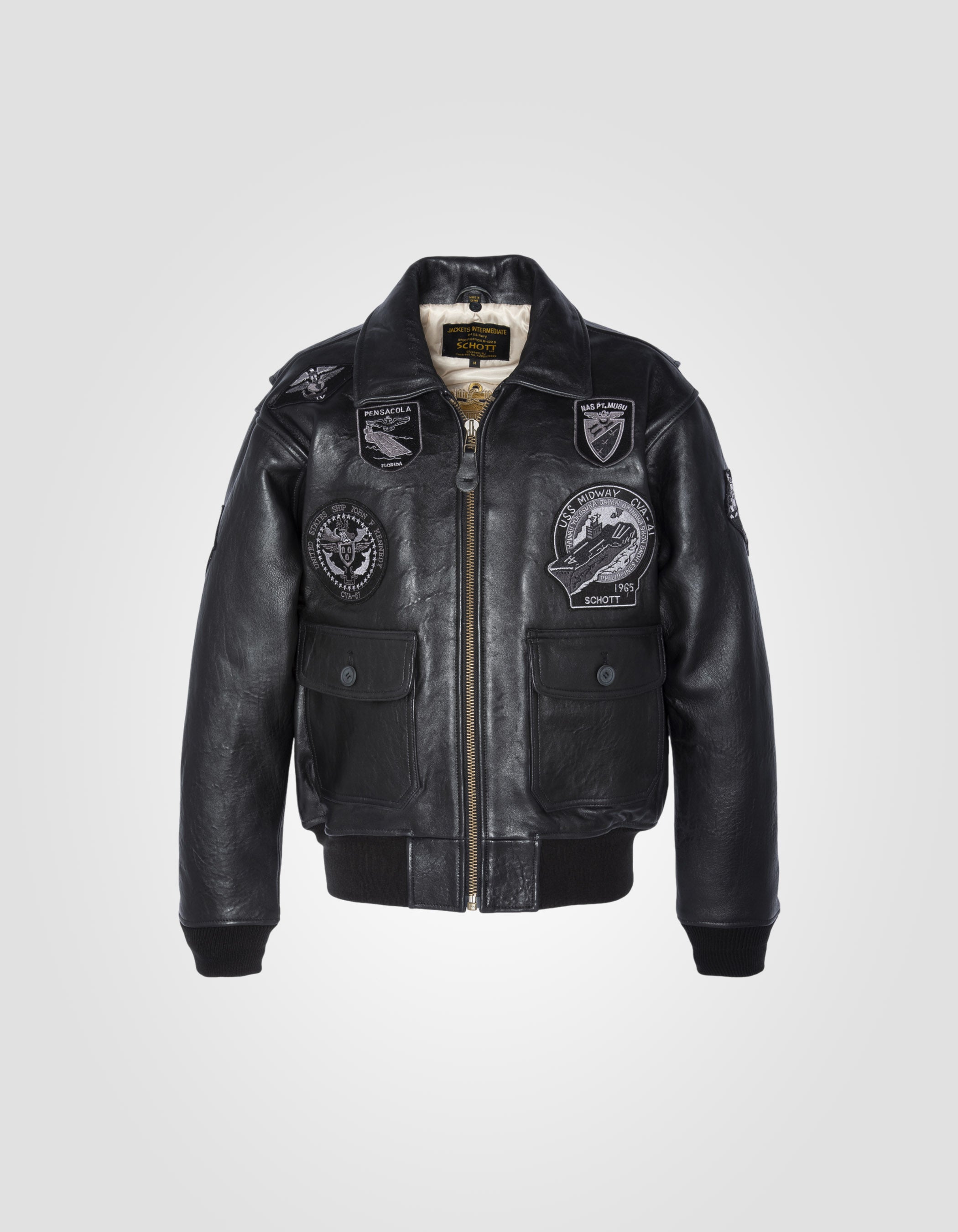 Les premiers aviateurs américain décoraient eux même leur cuir avec des patchs d'unité, des surnoms et des peintures. Cette veste de vol G1TG fortement décorée est confectionnée en cuir d'agneau antique épais et souple, avec un col en fourrure de mouton amovible. La doublure détaillée raconte l'histoire des Wings of Gold, un programme de formation en école de pilotage rigoureux, auquel sont soumis les aviateurs de l'U.S. Navy.