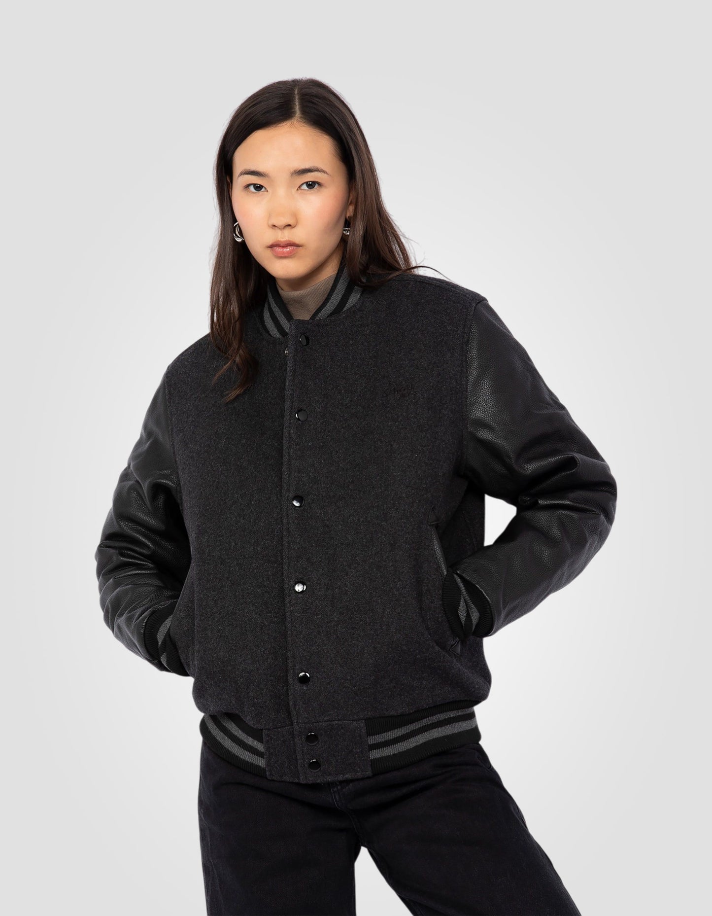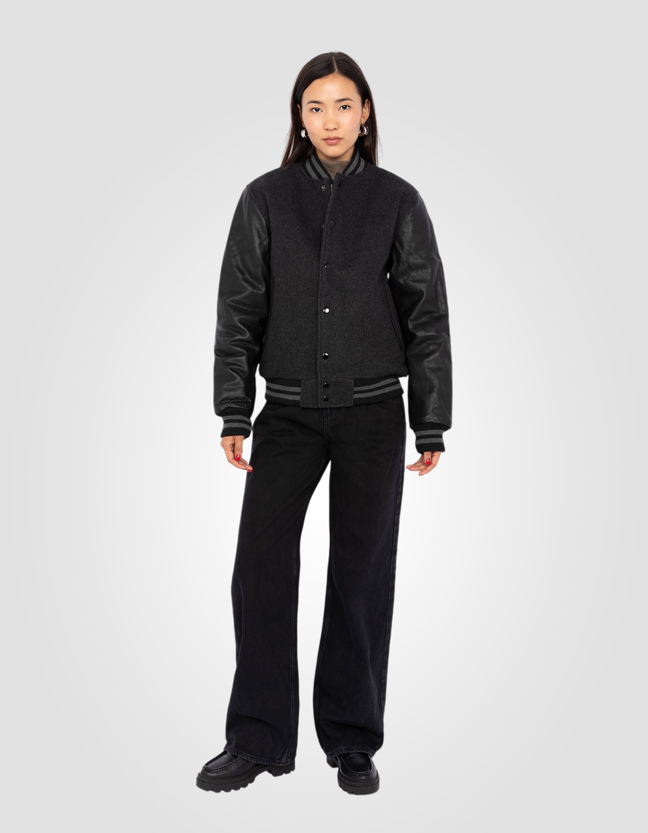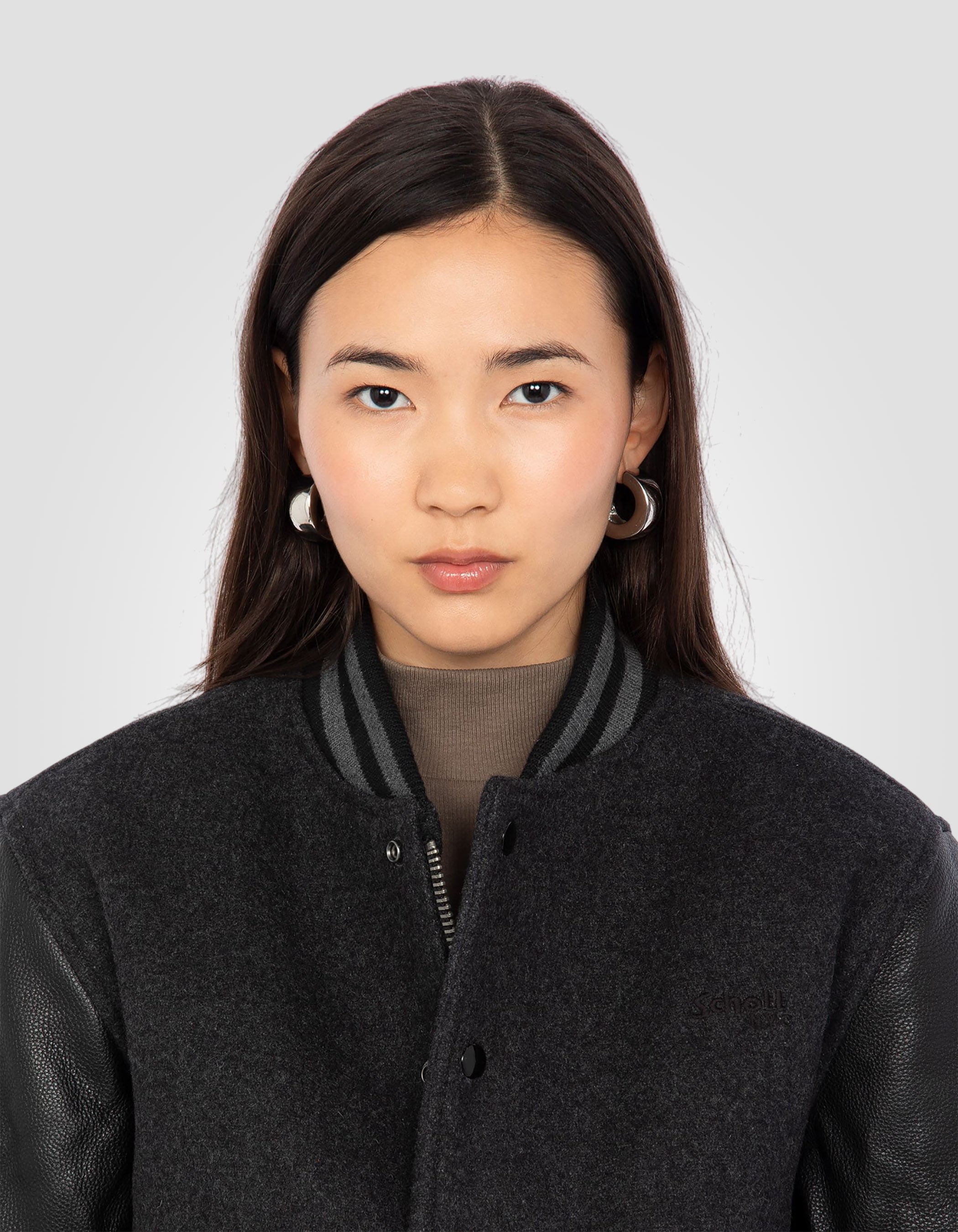 Blouson teddy gris et noir, cuir de vachette - GRIS/NOIR