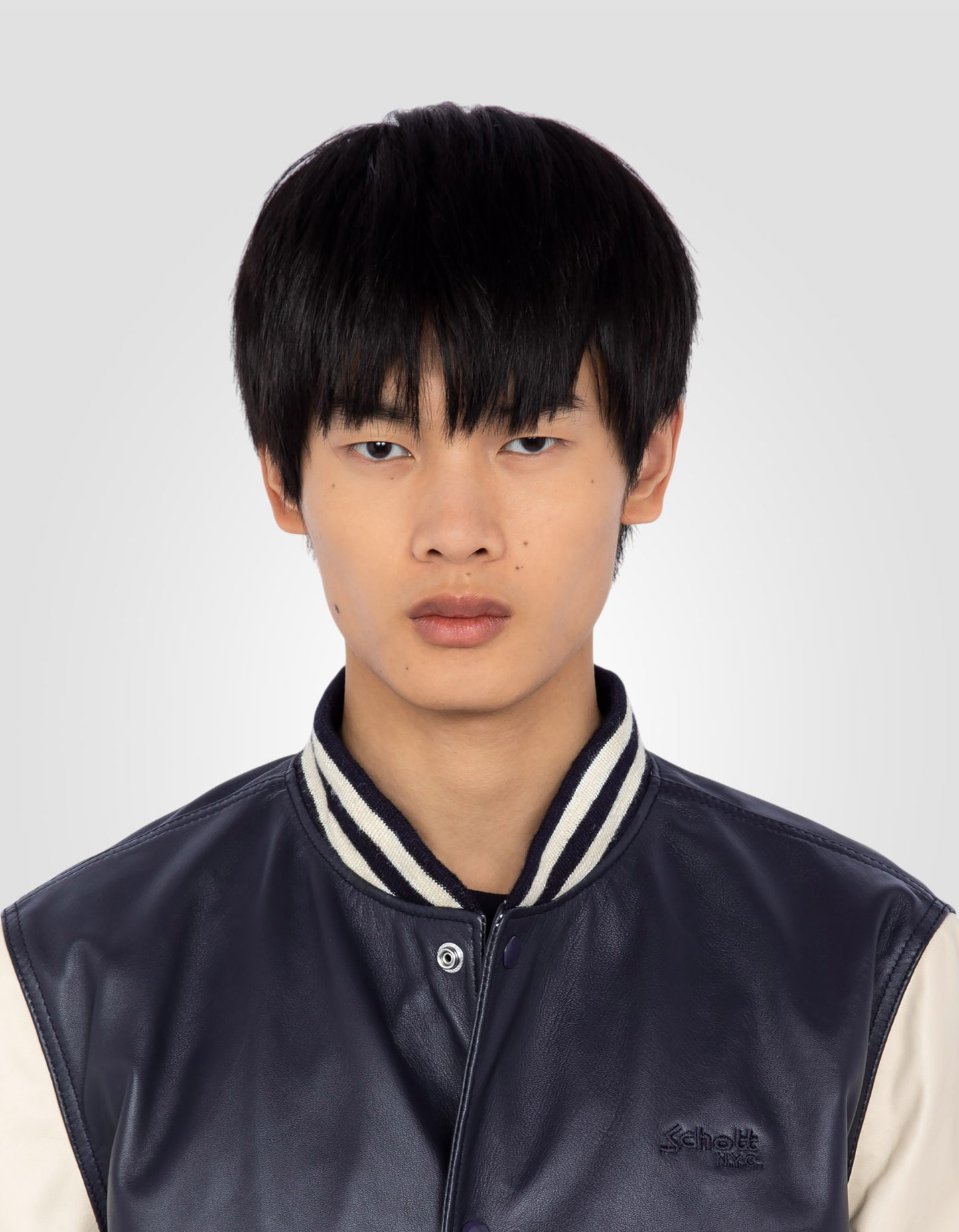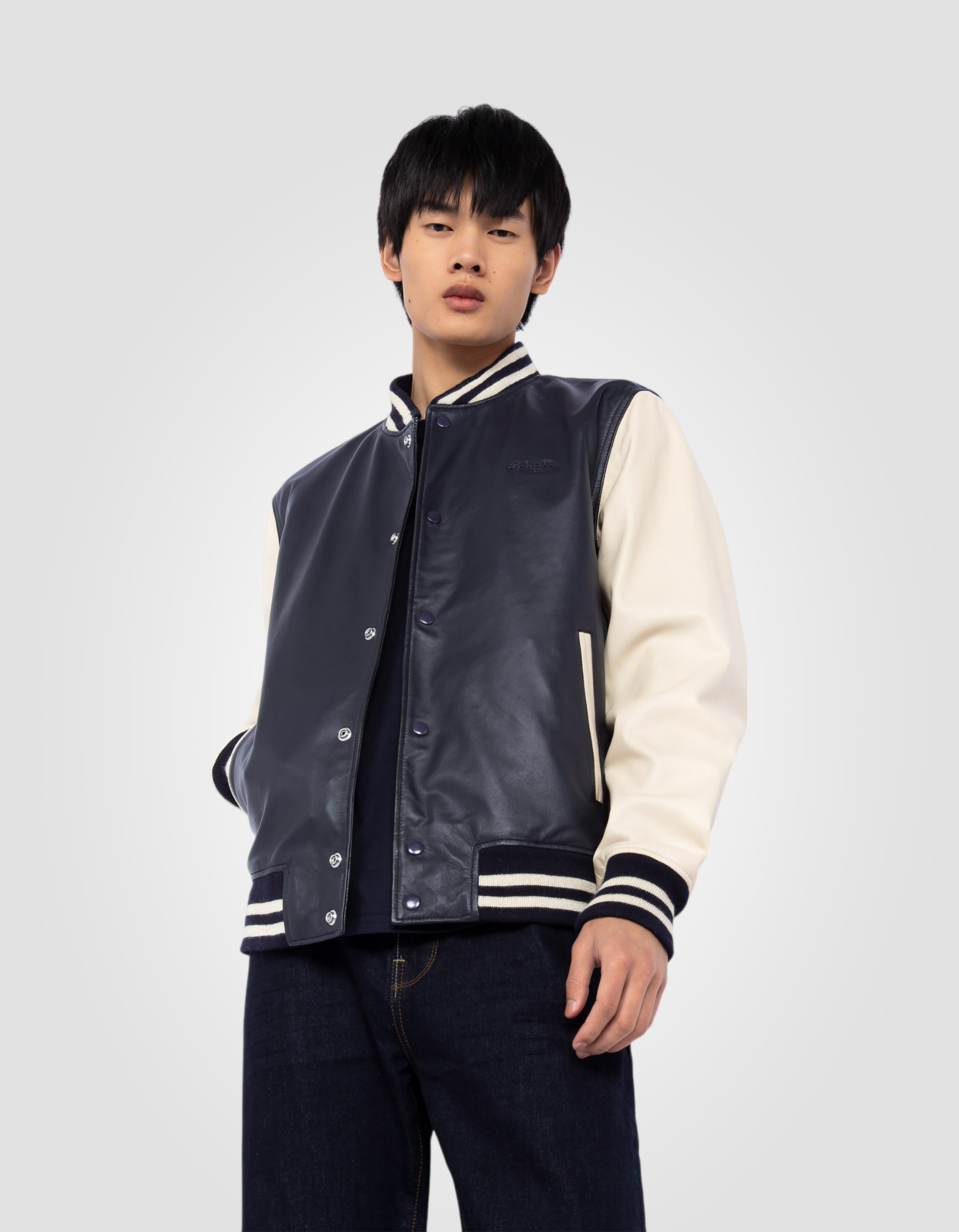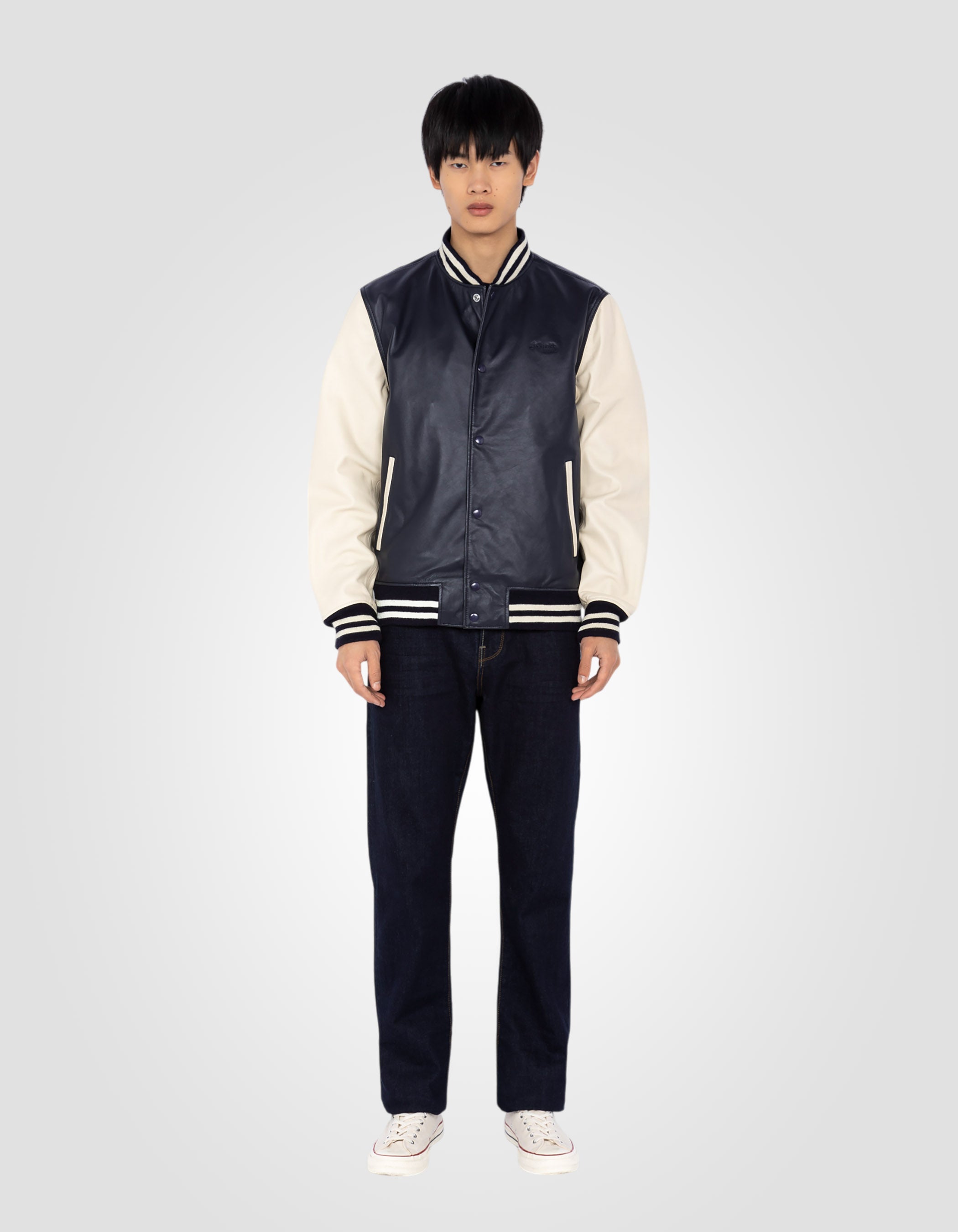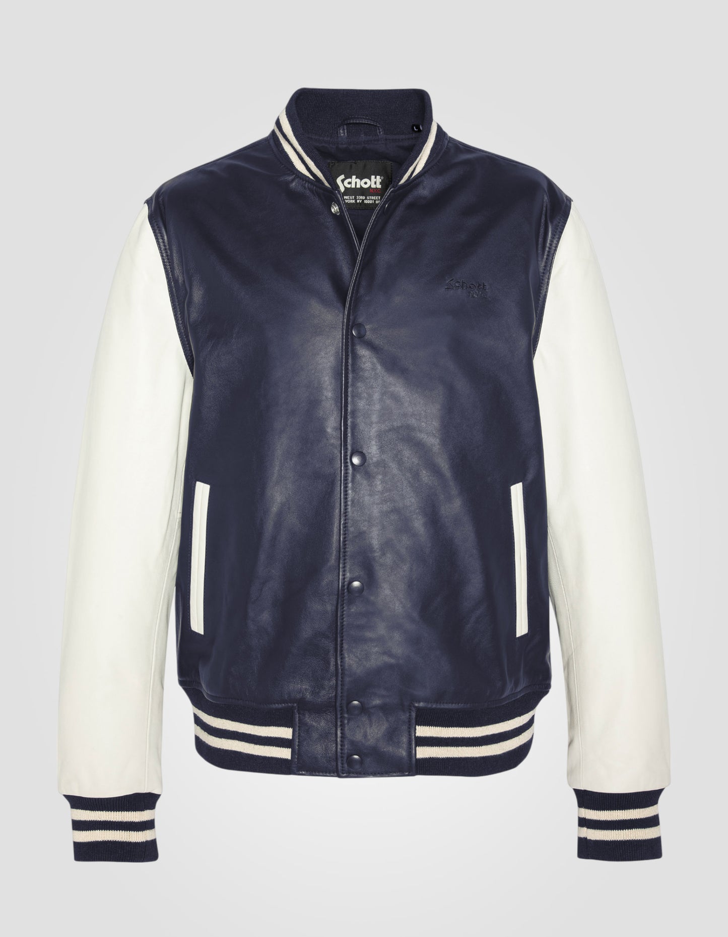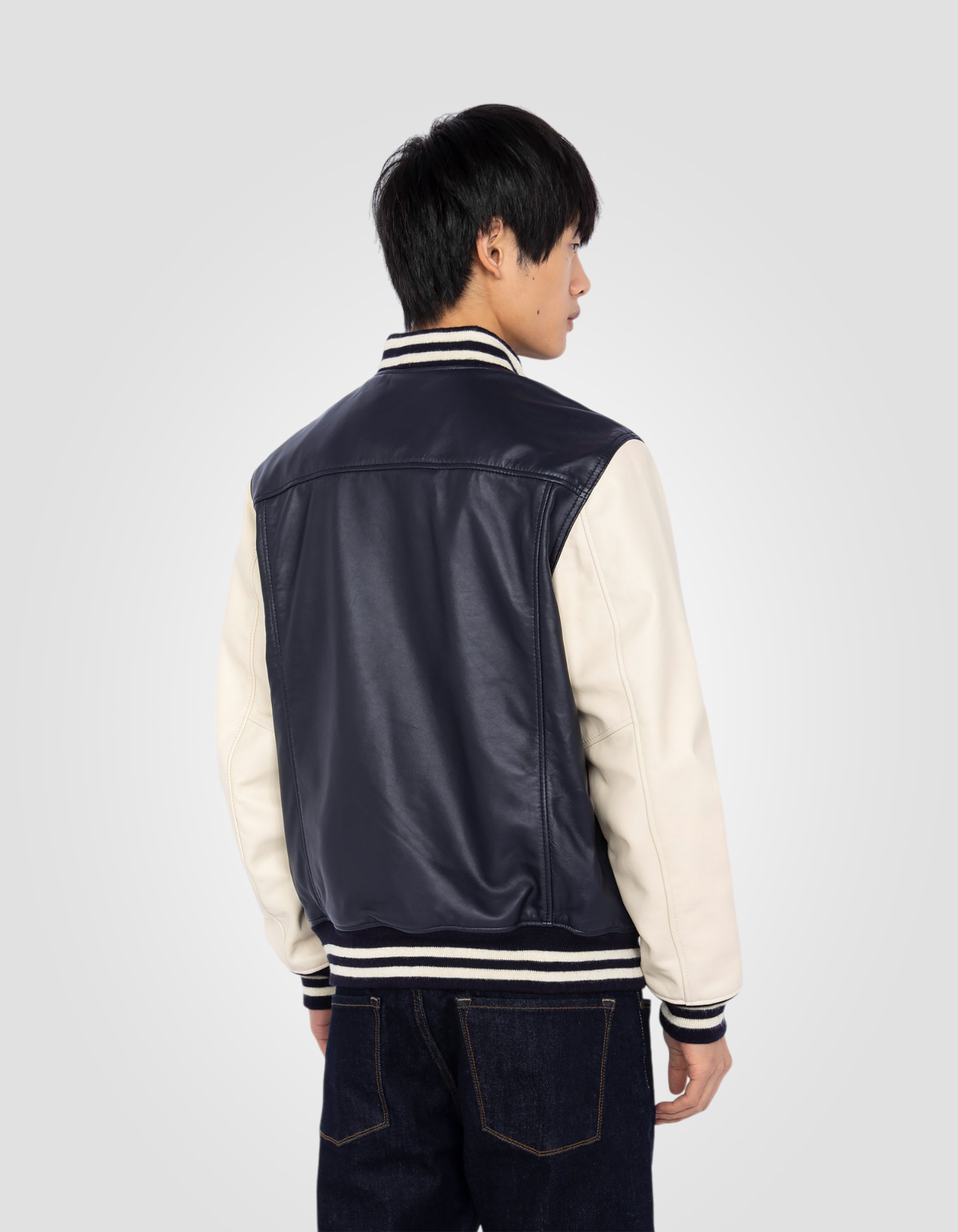 Blouson teddy bicolore bleu marine et blanc, cuir d'agneau