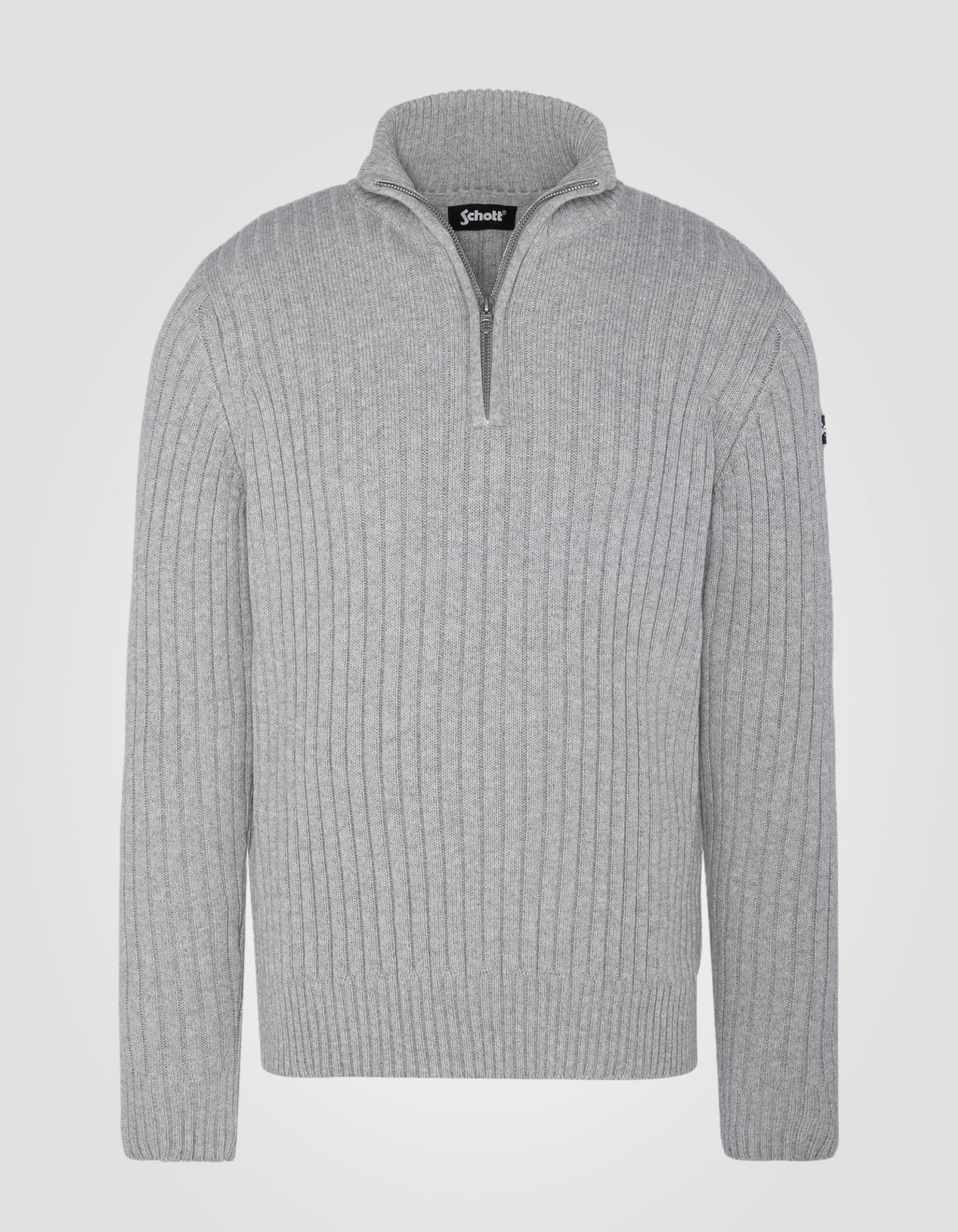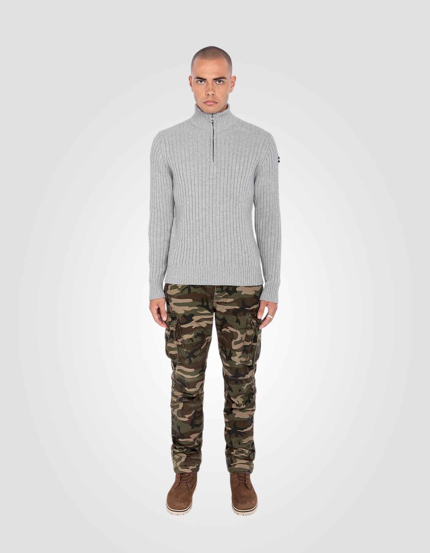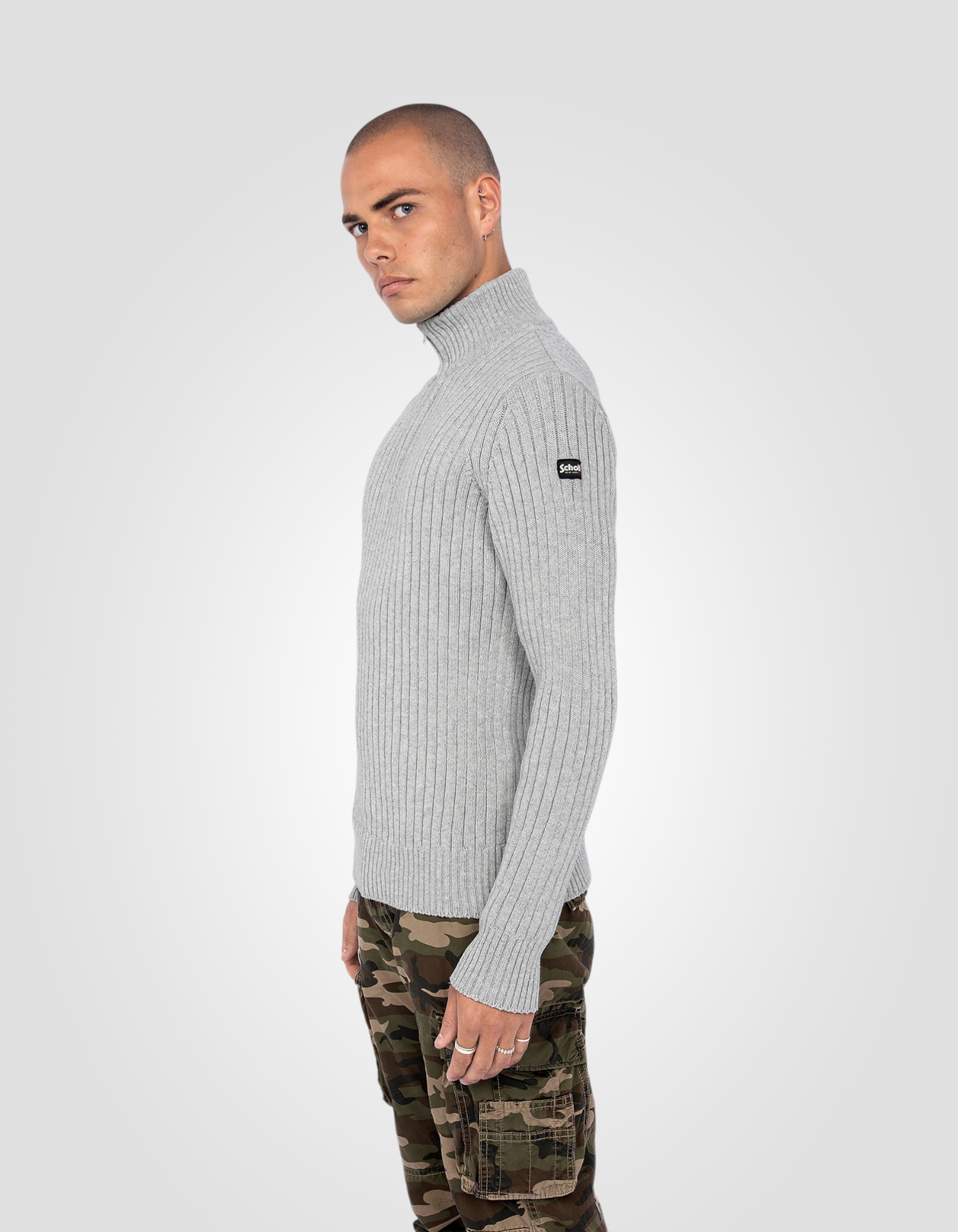 Ce pull camionneur en mailles côtelées est fabriqué à partir de fils recyclés.