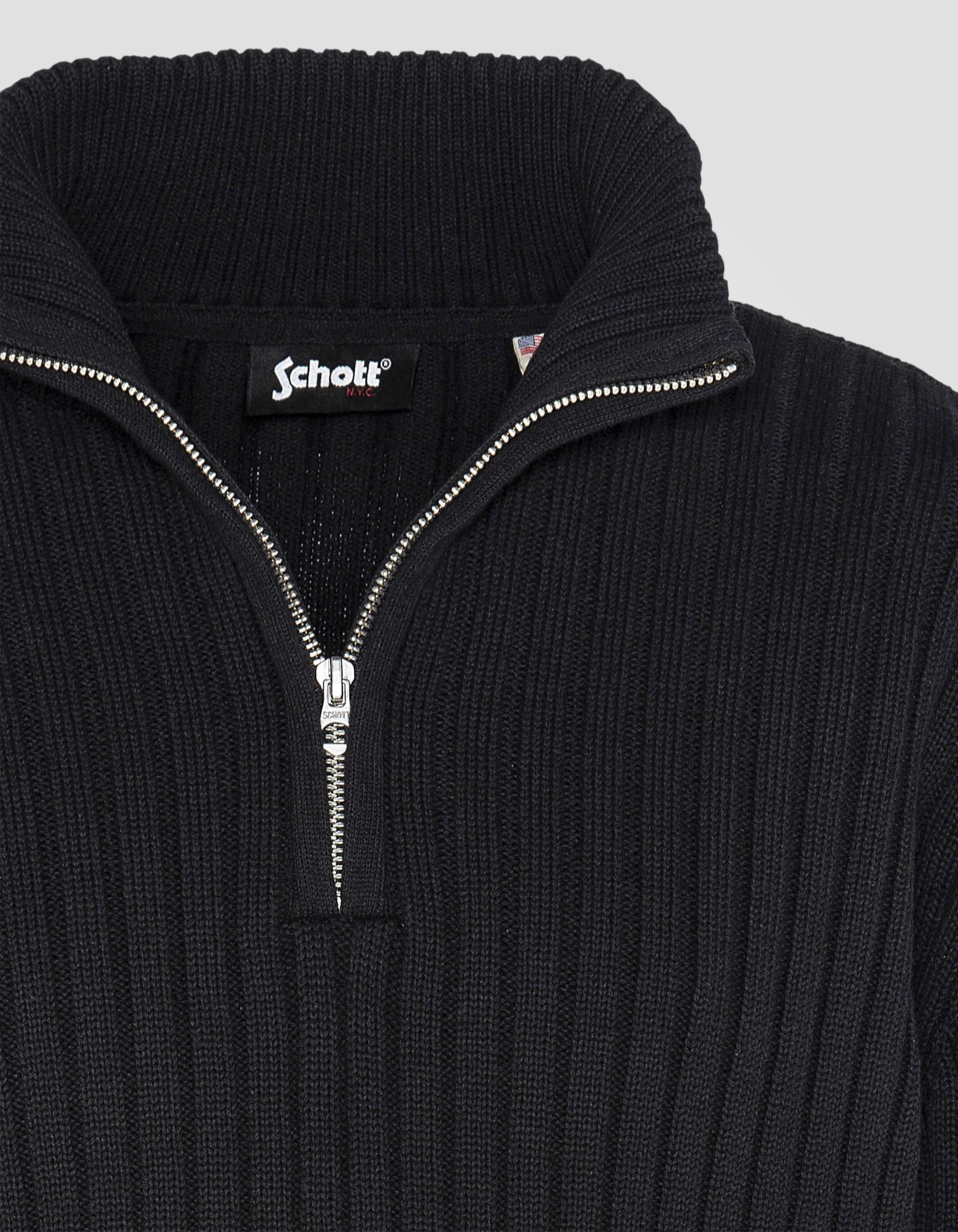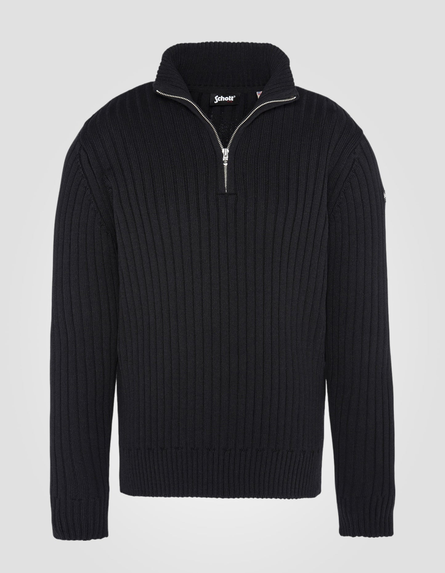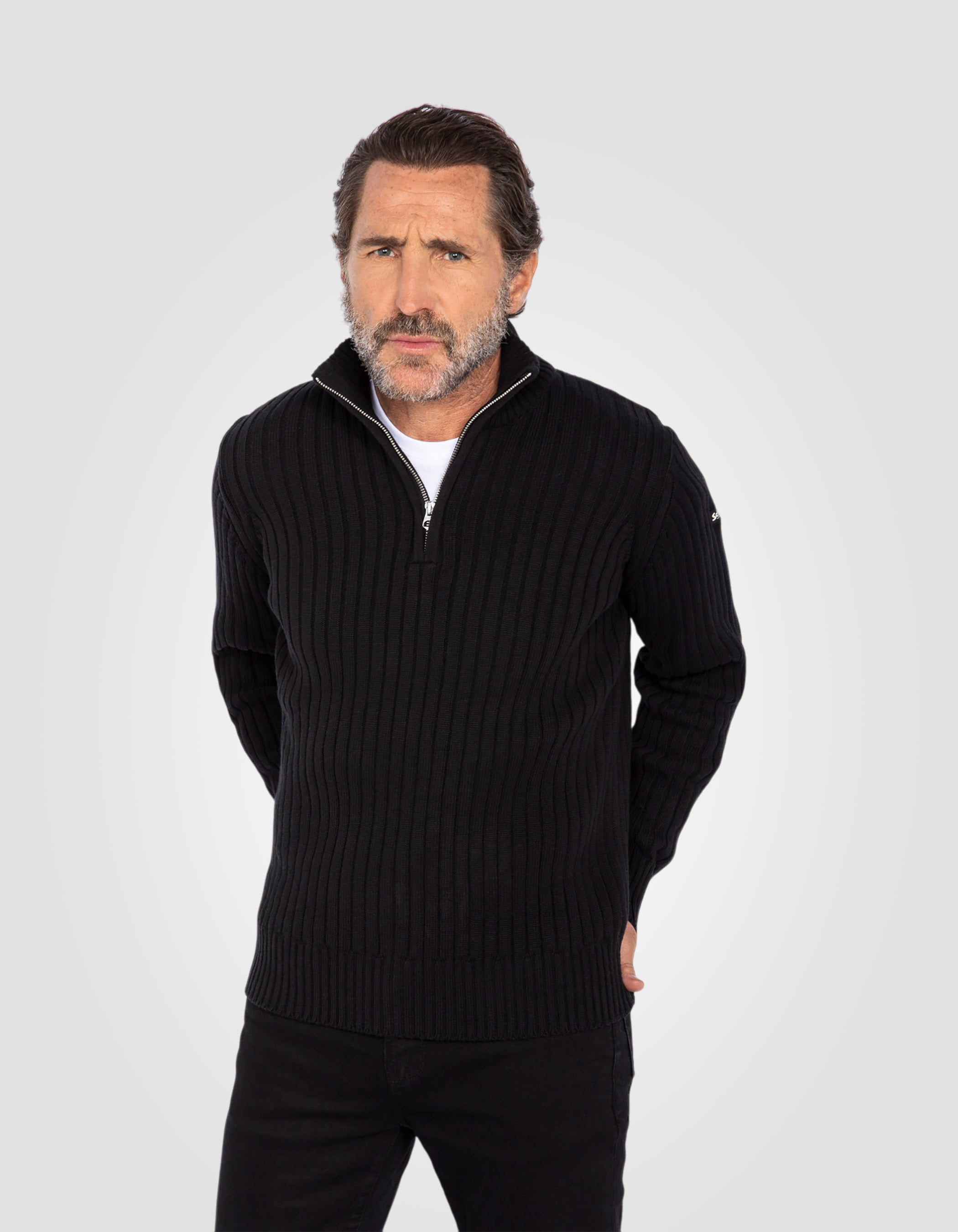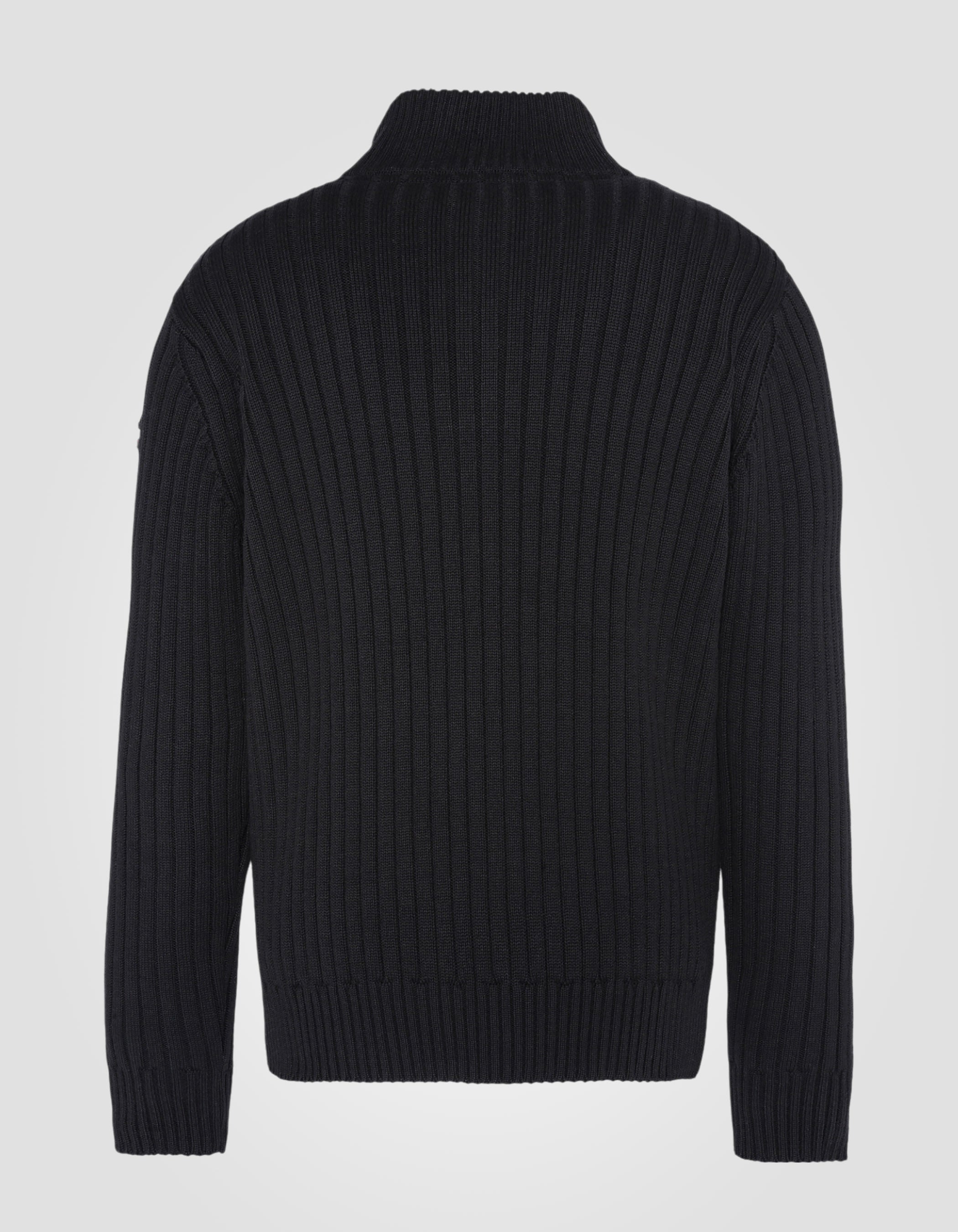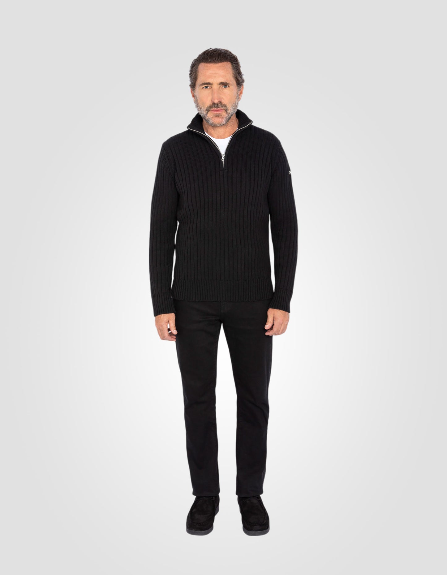 Ce pull camionneur en mailles côtelées est fabriqué à partir de fils recyclés.